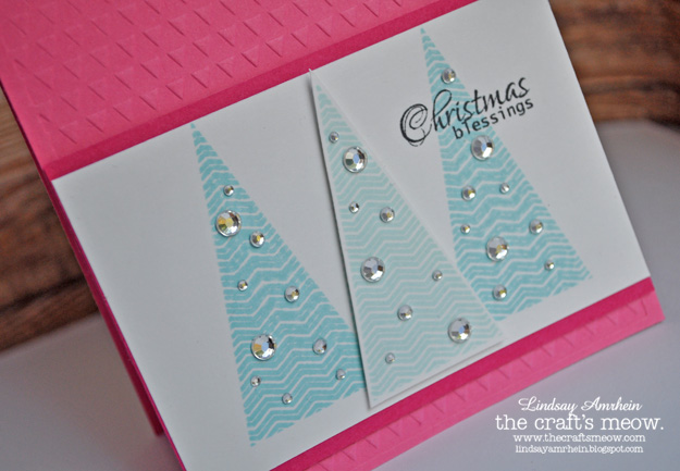 Lastly, I stamped the bird, cut it out and paper-pieced the leaf, adding red rhinestones as berries. I then stamped my sentiment repeatedly in black ink.
